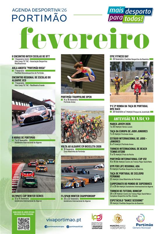 The monthly programme also includes federated events and initiatives promoting sports participation. The Portimão Trampoline Open, from 14 to 16 February at Portimão Arena, will bring together athletes from several national clubs in Trampoline and Tumbling disciplines. Admission is free.