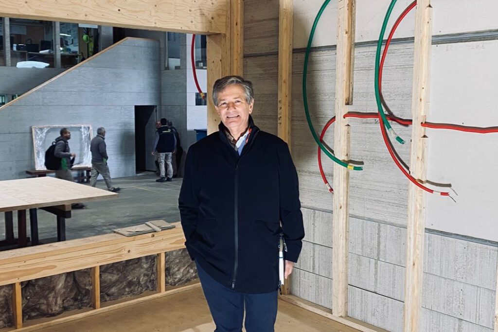 Jular’s Amaro Santos inside one the first floor of a pre-fabricated kindergarten. The coloured pipes are the electrical wiring pre-installed in the walls