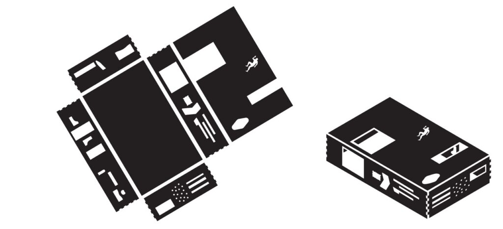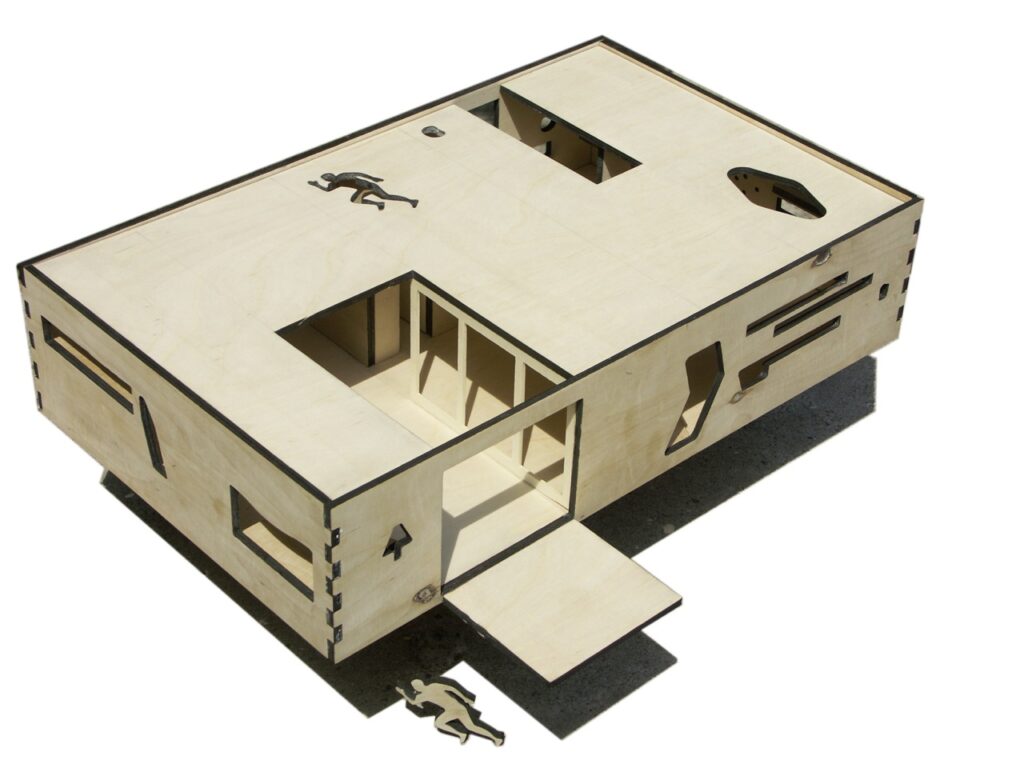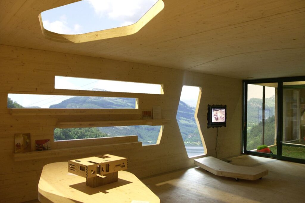 Thicker layers of wood pressed together can create beams longer, stronger and lighter than reinforced concrete, or the panels used for the Naked House, which are 13 m long by 3 m wide. The windows, doors and skylights were cut out in various shapes and made into furniture. “I basically cut the furniture from the walls. So think that a table cut from the wall becomes a window which lights the table, so the off-cut is the furniture, and therefore there’s no waste,” he explained. “It fits together like a jigsaw puzzle. It’s just a kind of geometry game.” A running man silhouette lets light into the toilet: “That’s me as a bathroom skylight.”
